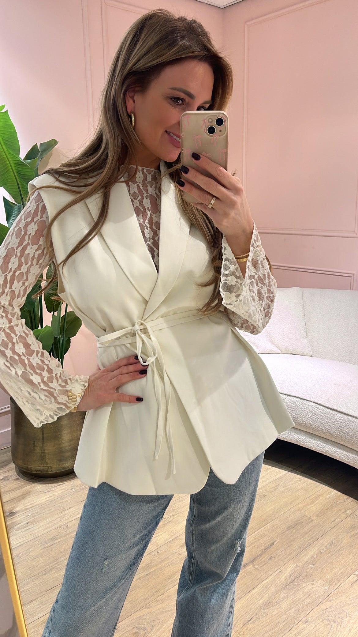 Dit gilet met korte mouwen is een echte eyecatcher ✨ Dankzij het vastzittende striklint kun je ’m speels tailleren voor een vrouwelijke pasvorm. Perfect om je outfit net dat beetje extra te geven.