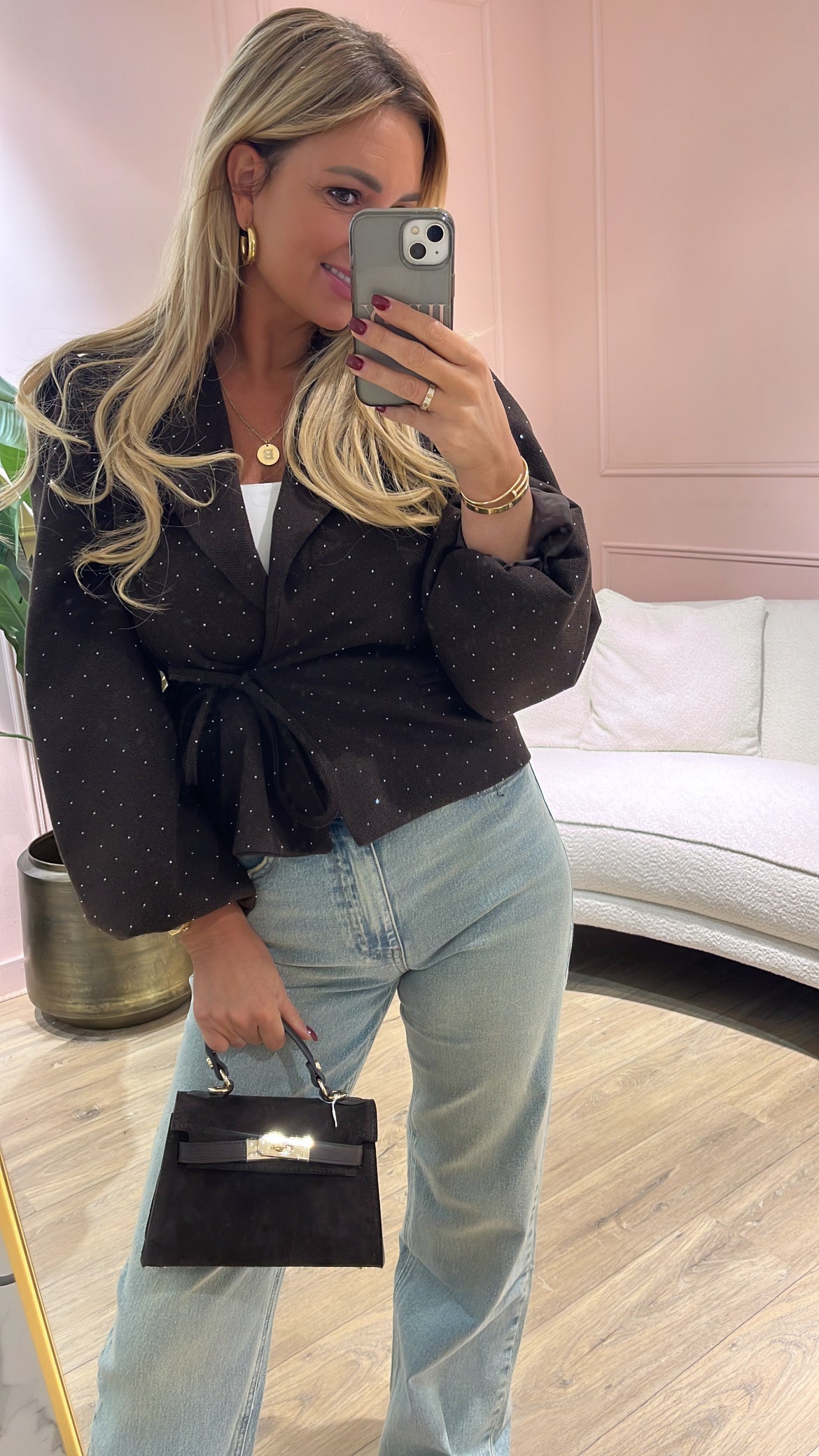 Dit korte jasje met subtiele strass steentjes en elegante pasvorm is een echte must-have voor jouw garderobe. De licht getailleerde snit en lange mouw zorgen voor een vrouwelijke uitstraling, terwijl de speelse details het een moderne twist geven. Perfect te combineren met een basic top en jeans voor een casual-chique look, of draag hem over een jurkje voor een classy uitstraling.
