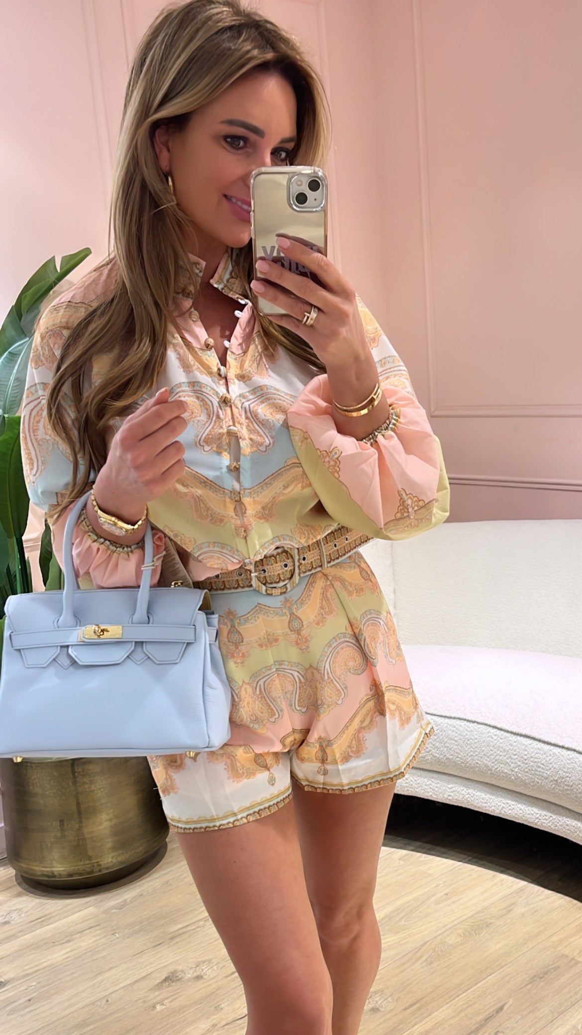 Dit elegante blousje met paisley print geeft jouw outfit een luxe en vrouwelijke uitstraling. De zachte pastelkleuren in combinatie met het verfijnde patroon zorgen voor een stijlvolle en zomerse look. Het blousje heeft een opstaande kraag, knoopsluiting en mooie details bij de mouwen die zorgen voor een chique finishing touch.