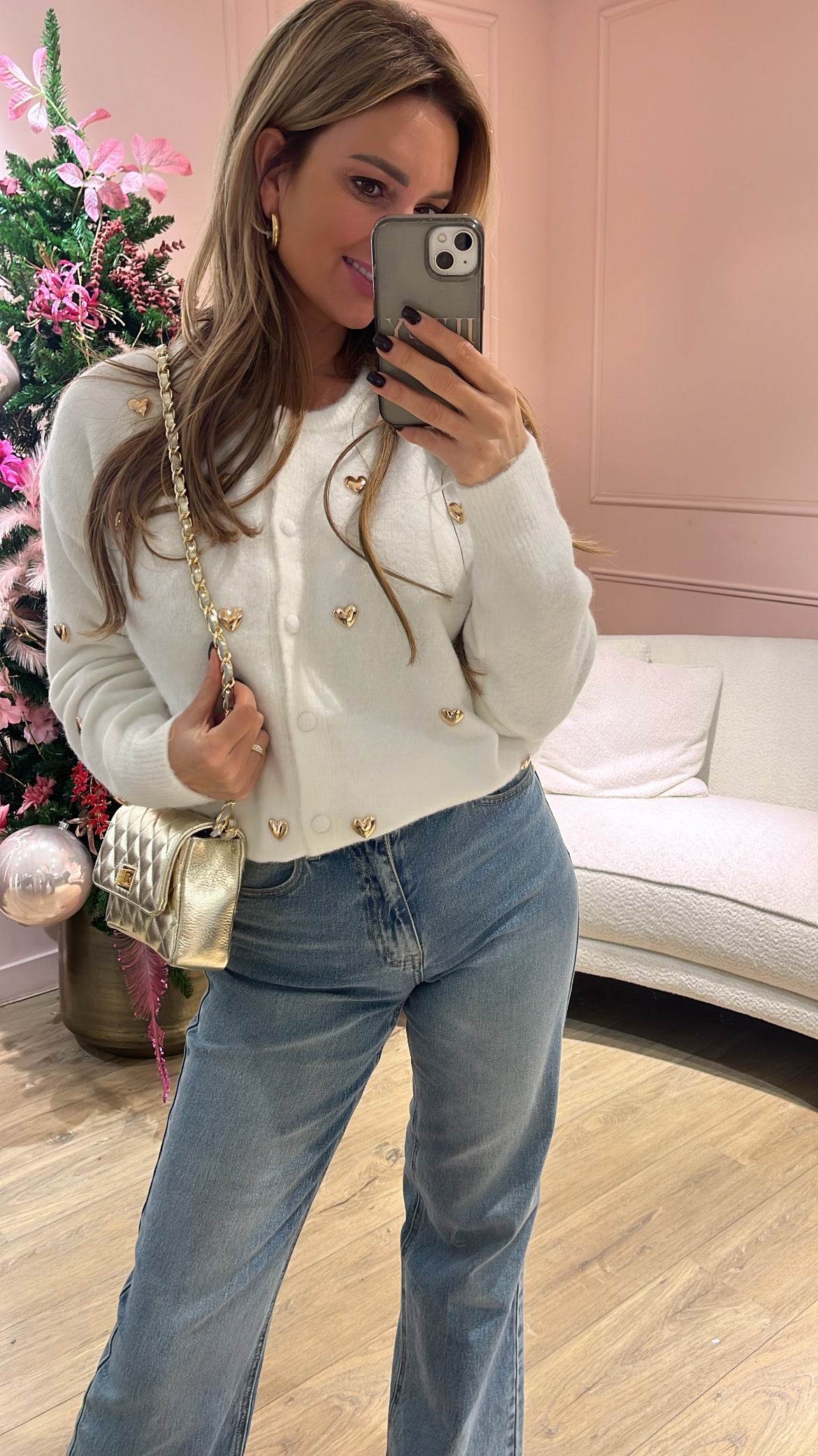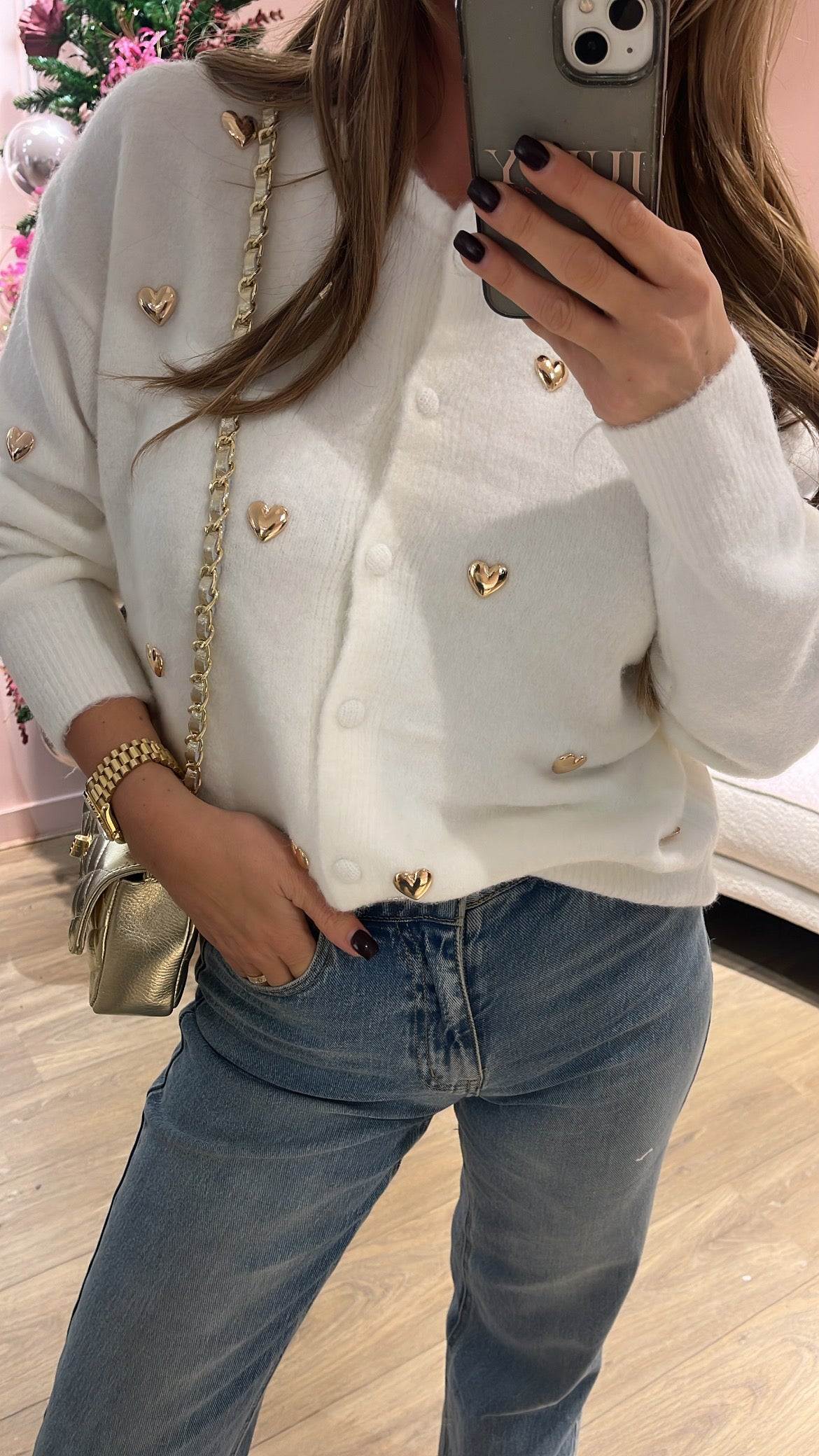 De Amora Heart Knit Cardigan is pure love in een trui 💘 De zachte knit, de elegante pasvorm en de gouden hartjes maken dit item een echte Juicy must-have. Draag ‘m met een leren short, jeans of rokje en you’re ready to steal hearts all day, every day.